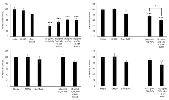 When FE1 cells were co-exposed for 24 h with 5 nM BafA1 and CuO, NiO, Al2O3, TiO2 NPs, or Mitsui-7 MWCNTs, an improvement in relative survival was only observed in cells exposed to 25 µg/mL CuO NPs (52% cell survival with 5 nM BafA1, 38% in the absence of BafA1) (Figure 2). Both conditions were statistically significantly different compared to dimethyl sulfoxide (DMSO)-treated cells but were not significantly different from each other. Cellular response to 54 µg/mL copper (II) chloride (CuCl2) did not change in the presence or absence of BafA1 (60–62% relative survival). For cells co-exposed to NiO, Al2O3, or TiO2 MONPs and 5 nM BafA1, an increase in cellular toxicity was observed in the presence of BafA1 compared to cells exposed to ENMs alone. With respect to NiO NPs, this difference was statistically significant (p < 0.01).