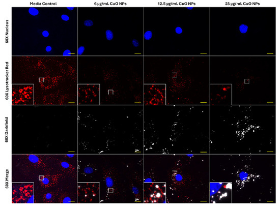 CuO NP particle suspension and cell seeding were conducted as described in Section 4.3 and Section 4.4. Cells were treated for 24 h with blank media or 6, 12.5, and 25 µg/mL CuO NPs. Lysotracker Red staining was conducted according to Section 4.6.
