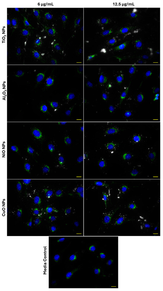 To test for particle localization to lysosomes and the effects of particle exposure on the cytoskeleton, FE1 cells were seeded for imaging analysis (Section 4.4). Following overnight recovery, cells were exposed to 6 or 12.5 µg/mL CuO, NiO, Al2O3, and TiO2 NPs. A concentration of 12.5 µg/mL had been used in the past to conduct co-localization analysis of SiO2 NPs with Lamp1 in FE1 cells [20], while a lower concentration of 6 µg/mL was included in the case that 12.5 µg/mL presented too many particles for analysis.