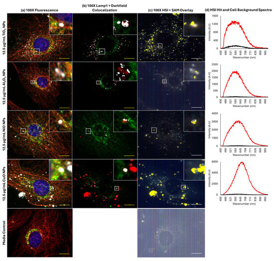 To determine the degree of co-localization of MONPs and Lamp1 signals, the overlap between Lamp1 and darkfield channels in 100× oil immersion images was measured in ImageJ 1.54f. Co-labelling with α-tubulin was used to visualize the cellular boundaries. Figure 5 and Figure S2 confirm that darkfield and Lamp1 signals showed subtle co-localization in all instances. For CuO and NiO NPs at 6 and 12.5 µg/mL and for 12.5 µg/mL Al2O3 NPs, only one image in three showed co-localization using this approach (Table 1). For CuO and Al2O3 NPs at 6 and 12.5 µg/mL and NiO NPs at 12.5 µg/mL, the maximum proportion of darkfield signal, which co-localizes with Lamp1 signal, is <10%. More pronounced co-localization was seen for TiO2 NPs, with 5/6 images showing signal co-localization. The maximum amount of co-localizing darkfield signal was concentration-dependent, with a maximum of 26.9% of the particle signal showing co-localization at 6 and 53.0% at 12 µg/mL. The identity of the co-localized bright objects was confirmed by hyperspectral imaging using pure particle libraries. Deconvolution of 100× 3D z-stacks captured for each image showed that the matched MONPs are in the same plane as the Lamp1 signal, and in close association (Figure S3).