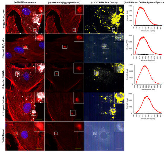 After 40× imaging, higher magnification images were captured at 60 and 100× using oil immersion objectives, in which 3 fields of view per coverslip were analyzed. At each field of view, the 60× image was taken, with the fluorescence channels imaged first (collar fully open, NA = 1.25), followed by the darkfield channel imaging with the collar fully closed (NA = 0.65). Once the 60× image was collected, the 100× objective was placed, and the imaging was repeated for the 60× objective, with NA = 1.3 for fluorescence imaging and 0.6 for darkfield imaging. The darkfield light source was set to 50% or 35% power at 60 and 100× (depending on the strength of scattering of the ENM); however, for imaging control cells, the light source was always set to 50% intensity, as this produces the stronger signal. At 60×, 5 ms of exposure time was used, whereas at 100×, 20 ms of exposure time was used. During the 100× imaging, HSI imaging proceeded darkfield image acquisition. For HSI acquisition, the darkfield light source was set to 50% intensity in all cases, the collar was fully closed on the 100× objective (NA = 0.6), the exposure time was set to 0.25 s, and the line number was set to 501. For identification purposes, HSIs from cells exposed to the material of interest were mapped using the SAM algorithm and filtered spectral libraries using a critical angle of 0.1 (same as what was used to filter the reference libraries). The final 2D fluorescence images were created by combining the fluorescence and darkfield channels in ImageJ 1.54f; however, the HSI imaging could not be directly overlaid due to small differences in the field of view, and it is shown side by side for comparison instead.