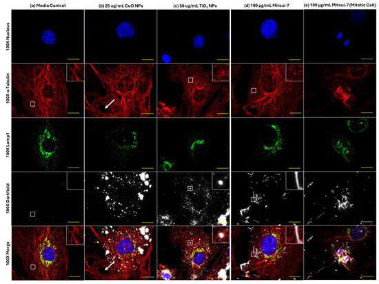 Based on representative 100× images in Figure 7a, control cells exposed to blank media showed well-defined reticular tubulin meshwork inside the cell, with the main Lamp1 signal located in the perinuclear region. No change in Lamp1 distribution was seen in response to any treatments; however, differences were seen with respect to effects on the α-tubulin cytoskeleton. In response to 25 µg/mL CuO NPs, large holes were observed in the α-tubulin structure (Figure 7b). Conversely, exposure to 50 µg/mL TiO2 NP induced fragmentation of tubulin fibers as compared to blank media treatment (Figure 7c). In contrast, 100 µg/mL Mitsui-7 MWCNTs did not appear to induce differences in background tubulin structure (Figure 7d); however, in cells undergoing division, association of MWCNT fibers with microtubules was observed (Figure 7e). Deconvolution of 3D stacks of the fiber-laden dividing cell showed the presence of MWCNTs intersecting the tubulin fibers, surrounding the mitotic nuclei (Figure S6).