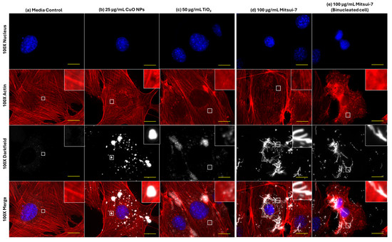 Effects of 24 h of exposure to (a) blank media, (b) 25 μg/mL CuO NPs, (c) 50 μg/mL TiO2 NPs, or (d,e) 100 μg/mL Mitsui-7 MWCNT on the F-actin cytoskeleton in FE1 cells. Yellow scale bars = 10 μm in each image. Red: F-actin. Blue: nucleus. White: particles or fibers. Insets represent an enlargement of the area highlighted by white squares.