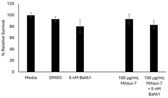 Relative survival of FE1 cells following 24 h treatment with Mitsui-7 +/− 5 nM BafA1. Error bars represent standard deviation (n = 3). Significance was determined through a one-way ANOVA with Tukey’s post hoc in the case of a significant result. No statistically significant differences are seen between the exposures.