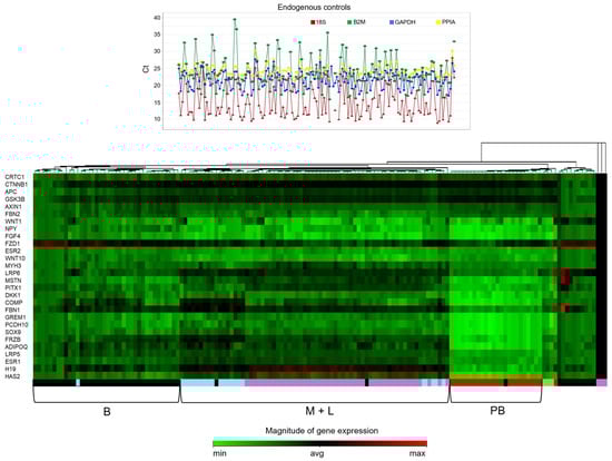 Unsupervised hierarchical clustering of gene expression data was performed with Expression Suite Software version 1.3 (Applied Biosystems Waltham, MA, USA) using Pearson’s correlation as the distance measure, average linkage as the clustering method, and global ΔCt as the zero point for the color scale. The colors indicate deviation from the mean ΔCt value, with red representing increased gene expression and green representing decreased gene expression.
