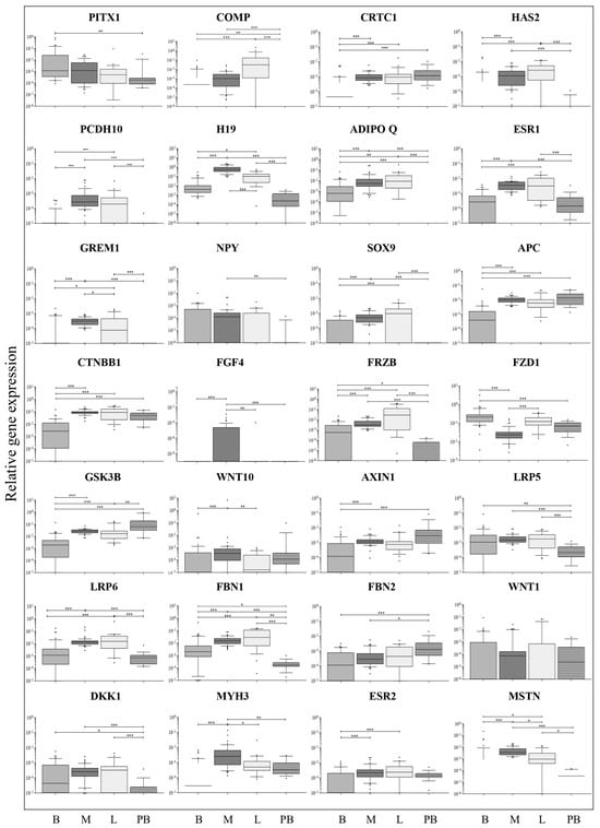 Local gene expression analysis in AIS tissues. Relative gene expression of 28 putative epigenetic markers of AIS progression in bone facets (B), intervertebral muscle (M), spinal ligament (L), and peripheral blood (PB) of 21 donors with AIS. Gene expression levels (relative to PPIA and GAPDH housekeeping genes) are shown as medians. Boxes indicate 10% to 90% percentiles, whiskers represent min to max values, and dots represent outliers. Comparisons among different tissue types were made using the Kruskal–Wallis test followed by Dunn’s correction for multiple comparisons. * = p ≤ 0.05; ** = p ≤ 0.01 *** = p ≤ 0.001.