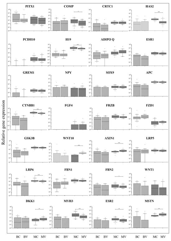 Local gene expression analysis in AIS tissues. Relative gene expression of 28 putative epigenetic markers of AIS progression in convex and concave bone facets (BV and BC, respectively) and in convex and concave paravertebral muscle (MV and MC, respectively) of 21 donors with AIS. Gene expression levels (relative to PPIA and GAPDH housekeeping genes) are shown as medians. Boxes indicate 10% to 90% percentiles, whiskers indicate min to max values, dots indicate outliers. Comparisons were made by the Wilcoxon matched-pairs test. * = p ≤ 0.05; ** = p ≤ 0.01 *** = p ≤ 0.001.
