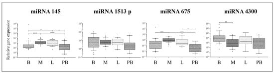 Local gene expression analysis in AIS tissues. Relative gene expression of 4 miRNAs possibly associated to AIS progression in bone facets (B), intervertebral muscle (M), spinal ligament (L), and peripheral blood (PB) of 21 donors with AIS. Gene expression levels (U6 miRNA used as reference) are shown as medians. Boxes indicate 10% to 90% percentiles, whiskers indicate min to max values, and dots indicate outliers. Comparisons among different tissue types were made by Kruskal–Wallis test followed by Dunn’s correction for multiple comparisons. * = p ≤ 0.05; ** = p ≤ 0.01 *** = p ≤ 0.001; **** = p ≤ 0.001.