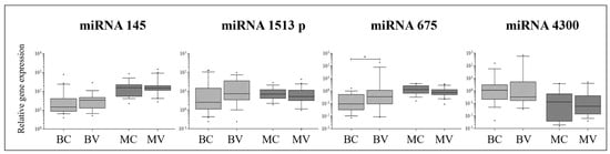 miRNA-145, miRNA-151-3p, miRNA-675, and miRNA-4300 were quantified compared to the reference miRNA U6 by semi-quantitative amplification with pre-designed Taqman miRNA assays (ThermoScientific, Waltham, MA, USA). A multiplexed RT step was applied to 500 ng RNA/sample with Multiscribe Reverse Transcriptase (ThermoScientific, Waltham, MA, USA): 30 min at 16 °C, 30 min at 42 °C, 5 min at 85 °C. Template cDNAs (0.08 μL) were then amplified for each target with Taqman Universal Master Mix II (ThermoFisher Scientific, Waltham, MA, USA) in a QuantStudio1 instrument for 10 min at 95 °C, followed by 40 cycles (15 s at 95 °C, 60 s at 60 °C). Relative quantification was carried out using the ΔΔCt method.