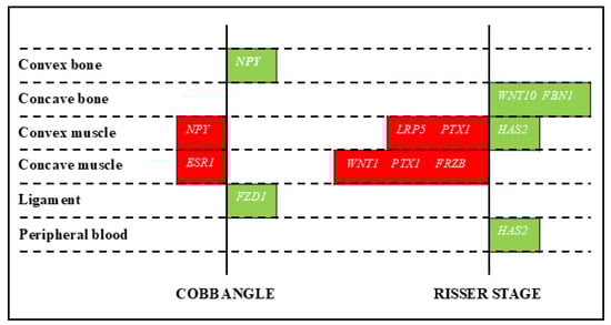 AIS musculoskeletal tissues almost always differed significantly from peripheral blood, suggesting caution in interpreting blood results as a surrogate for what happens in other tissues. Several genes showed different expression in peripheral blood compared to bone (PITX1, COMP, CRTC1, HAS2, ADIPO Q, APC, CTNBB1, FRZB, FZD1, GSK3B, AXIN 1, LRP5, FBN1, FBN2, and DKK1); muscle (COMP, CRTC1, HAS2, PCDH10, H19, ADIPO Q, ESR1, GREM1, NPY, SOX9, FRZB, LRP5, LRP6, FBN1, FBN2, DKK1, MYH3, and MSTN1); and ligament (COMP, CRTC1, HAS2, PSCDH10, H19, ADIPO Q, ESR1, GREM1, SOX9, FRZB, GSK3B, LRP5, LRP6, FBN1, DKK1, and MSTN) (Figure 2).