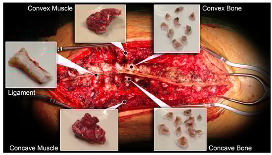 Surgical field of AIS correction showing position of bone facets (concave and convex), paravertebral muscle (concave and convex), and spinal ligament tissue sampling. A representative tissue sample of each type is also shown.