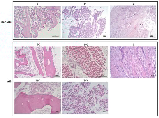 Hematoxylin–eosin staining of bone, muscle, and ligament samples from one representative donor without AIS (top) and one representative donor with AIS (bottom). B = bone (spinal facet); M = paravertebral muscle; L = spinal ligament; C = concave; V = convex.