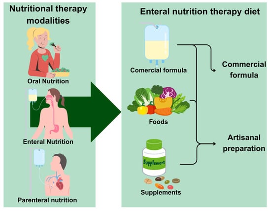 - Santos, D.C.d.; Ataide, C.D.G.; Mota da Costa, N.; Oliveira Junior, V.P.d.; Egea, M.B. Blenderized formulations in home enteral nutrition: A narrative review about challenges in nutritional security and food safety. Nutr. Rev. 2022, 80, 1580–1598. [Google Scholar] [CrossRef]