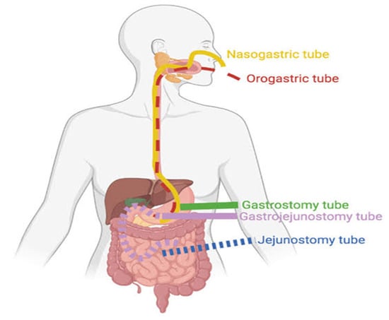 - Fugazza, A.; Capogreco, A.; Cappello, A.; Nicoletti, R.; Da Rio, L.; Galtieri, P.A.; Maselli, R.; Carrara, S.; Pellegatta, G.; Spadaccini, M.; et al. Percutaneous endoscopic gastrostomy and jejunostomy: Indications and techniques. World J. Gastrointest. Endosc. 2022, 14, 250–266. [Google Scholar] [CrossRef]