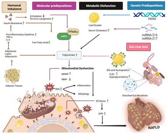 Mechanism of development. Insulin resistance upregulates De novo lipogenesis and downregulates β-oxidation, which leads to increase in free fatty acids and lipid droplet buildup in the liver. With the upregulated lipogenesis and decreased β-oxidation, the activation of AMPK and PPARα fails, which impairs lipid clearance and causes increase in triglyceride. Pro-inflammatory cytokines such as TNF-α and IL-6 exacerbate insulin resistance and lipid abnormalities. Disruptions in adipokines, including leptin and adiponectin, additionally facilitate a reduction in mitochondrial outer membrane permeability. Metabolic disturbances, such as increased blood cholesterol, VLDL, and hypertriglyceridemia, are exacerbated by bile acid imbalance. The gut–liver axis, characterized by a modified microbiota and elevated levels in the intestine, contributes to heightened triglyceride levels, resulting in systemic inflammation. Genetic factors, namely polymorphisms in the FADS2 gene, contribute to elevated blood cholesterol, hence disrupting bile acid homeostasis and causing mitochondrial dysfunction. MicroRNAs, including miRNA-216 and miRNA-217, are also involved in metabolic changes causing fibrosis of liver. Mitochondrial dysfunction, characterized by increased mitochondrial outer membrane permeability (MOMP) and disrupted membrane potential (MMP), is a central factor that results in impaired energy metabolism, elevated ROS production, and inflammation, while endoplasmic reticulum stress triggers UPR (unfolded protein response), exacerbates lipid accumulation, and hepatic inflammation.
