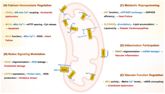 Building on the structural and functional diversity of mitochondrial transporters outlined in Section 2, we now dissect their mechanistic roles in driving cardiovascular pathologies. This section explores how dysregulation of these transport systems—particularly in calcium homeostasis, redox signaling, metabolic reprogramming, inflammation, and vascular function—orchestrates hallmark features of CVDs. We synthesize evidence linking specific transporters (e.g., MCU-induced Ca2+ overload, VDAC1-mediated ROS leakage, and TRP channel-driven fibrosis) to disease progression, providing a foundation for targeted therapeutic strategies.