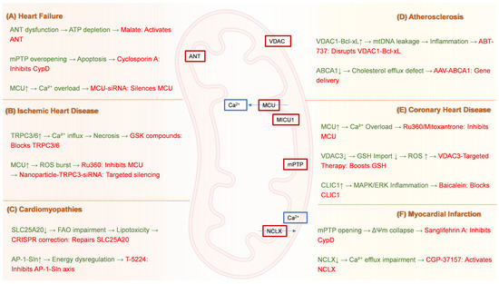 Mitochondrial Transporter-Targeted Therapeutic Strategies for Cardiovascular Diseases. (A) Heart failure: Cyclosporin A inhibits CypD to suppress mPTP overopening, while MCU-siRNA silences the mitochondrial calcium uniporter to prevent Ca2+ overload. (B) Ischemic heart disease: GSK compounds block TRPC3/6 channels to reduce pathological Ca2+ influx; Ru360 inhibits MCU to attenuate ROS generation; Nanoparticle-TRPC3-siRNA enables targeted channel silencing. (C) Cardiomyopathies: CRISPR correction repairs SLC25A20 mutations to restore fatty acid oxidation, and T-5224 inhibits the AP-1-Sin axis to counteract energy dysregulation. (D) Atherosclerosis: ABT-737 disrupts VDAC1–Bcl-xL interactions to prevent mtDNA leakage, while AAV-ABCA1 gene therapy enhances cholesterol efflux via ATP-binding cassette transporter A1 delivery. (E) Coronary heart disease: Ru360 or Mitoxantrone inhibits MCU to alleviate Ca2+ overload; VDAC3-targeted therapy boosts GSH import to reduce ROS; Baicalein blocks CLIC1 to suppress MAPK/ERK-driven inflammation. (F) Myocardial infarction: Sanglifehrin A inhibits CypD to prevent mPTP opening, and CGP-37157 activates the NCLX to restore Ca2+ efflux. CypD, Cyclophilin D; mPTP, Mitochondrial permeability transition pore; MCU, Mitochondrial calcium uniporter; Ca2+, Calcium ion; siRNA, Small interfering RNA; TRPC, Transient receptor potential canonical; ROS, Reactive oxygen species; CRISPR, Clustered regularly interspaced short palindromic repeats; SLC25A20, Solute carrier family 25 member 20; FAO, Fatty acid oxidation; AP-1-Sin, AP-1-Sin3 transcriptional regulatory axis; VDAC, Voltage-dependent anion channel; Bcl-xL, B-cell lymphoma-extra large; mtDNA, Mitochondrial DNA; AAV, Adeno-associated virus; ABCA1, ATP-binding cassette transporter A1; GSH, Glutathione; CLIC1, Chloride intracellular channel 1; MAPK/ERK, Mitogen-activated protein kinase/extracellular signal-regulated kinase; NCLX, Mitochondrial Na+/Ca2+ exchanger.