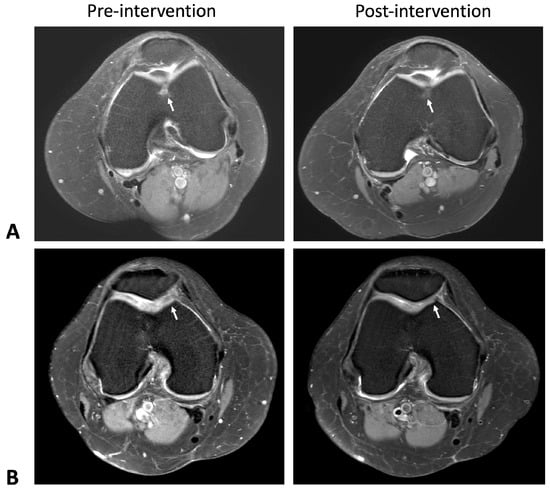 Axial knee MRI images obtained using the T2-weighted echo spin technique, illustrating pre-intervention and post-intervention subjects. (A) The arrow indicates a cartilage lesion at the femoral trochlea groove, modified from Outerbridge Grade 3 to Grade 2, with a decrease in subjacent marrow edema. (B) Grade 3 cartilage lesion at the medial patella facet ridge reduced in size from 12 × 10 mm to 10 × 9 mm, with a decrease in subjacent marrow edema as indicated by the arrow.