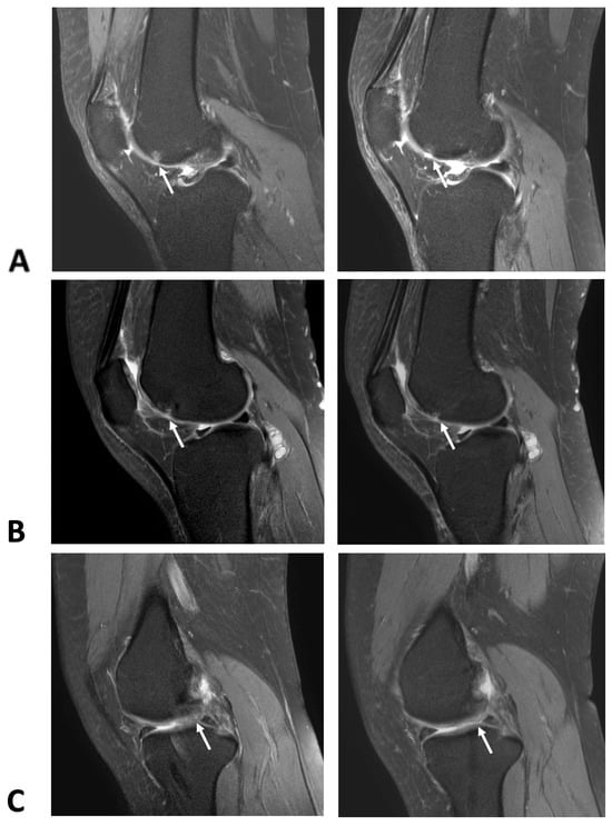 MRI T2-weighted spin echo sagittal view of pre-intervention and post-intervention subjects. (A) Arrow indicates a reduction in size of the Grade 2 cartilage lesion at the medial femoral cartilage, from 16 × 12 mm to 15 × 11 mm, along with a decrease in the subjacent marrow edema. (B) Arrow shows the disappearance of the previous Grade 1 cartilage lesion at the mid-lateral femoral condyle and a reduction in the subjacent bone edema. (C) Arrow indicates a slight decrease in the area of Grade 3 cartilage damage at the medial femoral condyle and medial tibial plateau, measuring 14 × 9 mm and 10 × 6 mm, respectively.
