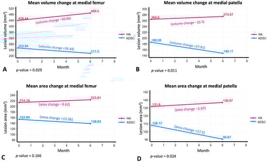 MRI Findings of a mean medial compartment cartilage. Medial cartilage lesion volume in both femur (A) and patella (B) significantly decreased in the ADSC group but increased in the HA group. Medial cartilage lesion area in both femur (C) and patella (D) decreased in the ADSC group, whereas the HA group observed more cartilage loss. The blue and pink lines indicate the ADSC and HA groups, respectively.