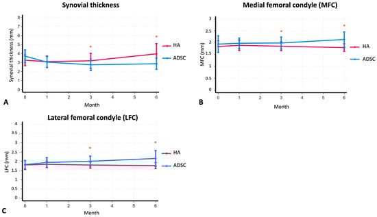 Comparison of (A) the thickness of knee synovial tissue, (B) the thickness of the medial femoral condyle (MFC), and (C) the thickness of the lateral femoral condyle (LFC) between the groups that received hyaluronic acid (HA) and adipose-derived mesenchymal stem cells (ADSCs) after a 6-month period of injection. Asterisks show significant differences between groups at p < 0.05.