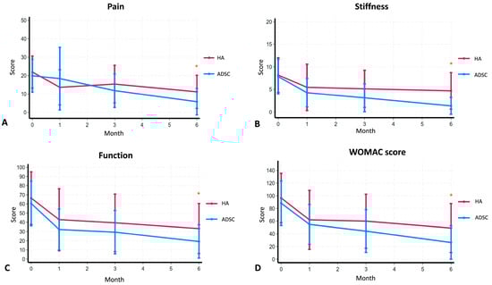 Comparison of (A) the pain scores, (B) the stiffness scores, (C) the functional ability scores from the WOMAC score, and (D) the total WOMAC score between the groups that received hyaluronic acid (HA) and adipose-derived mesenchymal stem cells (ADSCs) after a 6-month period of injection. The mean ± SD values are plotted. Asterisks show significant difference between groups at p < 0.05.