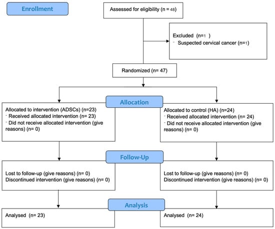 Participants were required to abstain from any treatments directed at the knee area and from using analgesics, including nonsteroidal anti-inflammatory drugs (NSAIDs), for at least 2 weeks before this study commenced. One participant was excluded during screening due to having a risk of cervical cancer. This study was planned as a prospectively randomized, single-blind (data collector radiologist and interventionist), and active-control study to evaluate the safety and efficacy of autogenic ADSCs. To ensure the high quality of the final cell product, all ADSC preparation processes were conducted at an accredited cell bank laboratory, where a well-established standardized protocol for stem cell isolation and culture was followed. When the cell preparation was completed, the treatment date was scheduled. The study participants were divided into two groups using computer-generated randomization blocks of six. The randomization process was conducted using sealed envelopes, and the numerical codes for each group were generated by a computer. A total of 23 participants (48.94%) had ADSCs harvested by liposuction, purified, and amplified before reinjecting intraarticularly, and 24 participants (51.06%) were injected with hyaluronic acid (control group). The CONSORT flow chart is shown in Figure 6. Patients with knee osteoarthritis were intra-articularly injected by using the ultrasound-guided technique. This study was registered on 29 September 2023 with the Thai Clinical Trials Registry (https://www.thaiclinicaltrials.org/show/TCTR20230929002 accessed on 1 July 2025). The procedures followed were in accordance with the ethical standards of the responsible committee on human experimentation (The Institutional Review Board, Royal Thai Army Medical Department, Phramongkutklao College of Medicine (IRBRTA637/2564) and human research ethic committee, Suranaree University of Technology (EC-64-90), Thailand).