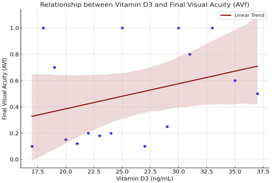 Descriptive analysis revealed an apparent trend wherein individuals with serum vitamin D3 levels in the range of 30–35 ng/mL tended to attain final visual acuity (AVf) scores between 0.8 and 1.0. Conversely, those with levels below 15 ng/mL typically exhibited final acuity values below 0.4. Despite this observation, statistical analysis did not support a linear relationship (Pearson’s r = −0.014). Nevertheless, these findings imply that vitamin D3 may serve as a useful adjunct biomarker, reflecting a more favorable physiological context in which anti-VEGF therapy could yield enhanced outcomes.