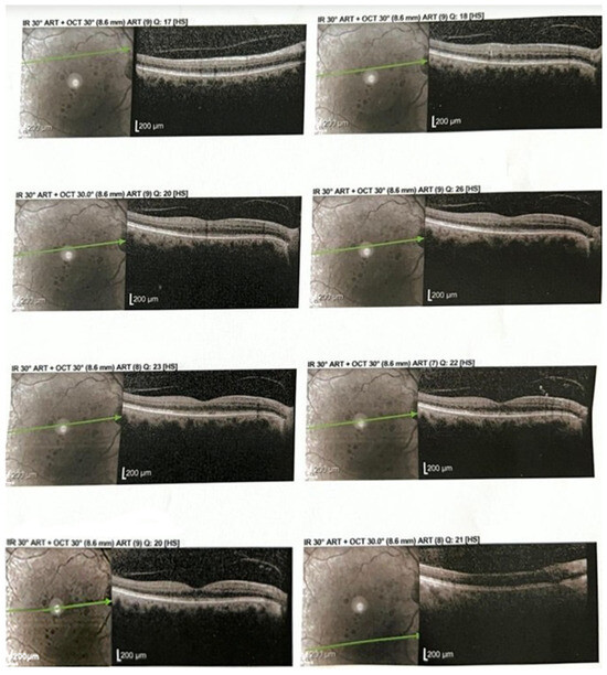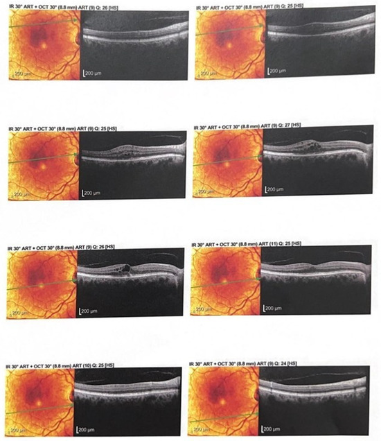 Follow-up OCT scans revealed restoration of the foveal contour and a significant reduction in intraretinal fluid after aflibercept treatment (Figure 3).