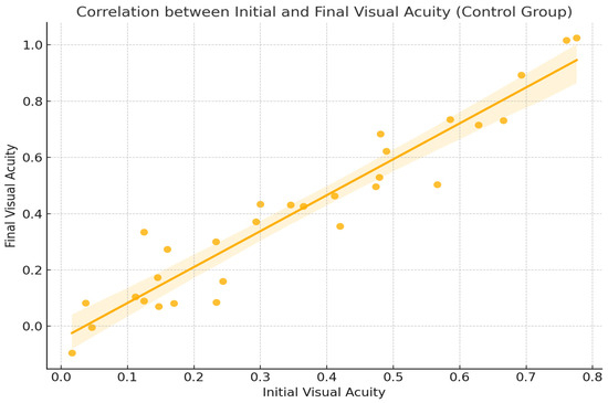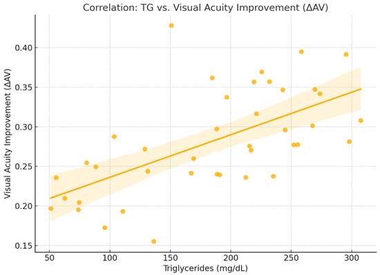 In this analysis, the Pearson correlation coefficient was r = 0.15, suggesting a positive correlation between triglyceride (TG) levels and improvement in visual acuity (ΔAV = AV_f − AV_i). This correlation is less intuitive. It appears that patients with elevated triglyceride levels experienced somewhat greater improvements in visual acuity. Possible explanations may include increased treatment sensitivity in the context of inflammation and vascular instability commonly associated with dyslipidemia [13,14].