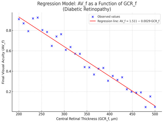 Central retinal thickness (CRT) represents a clinically relevant biomarker, often indicative of disease severity and therapeutic response in diabetic macular edema [3,4]. In this study, we investigated the association between post-treatment CRT and final visual acuity (AV_f) through a univariate linear regression model.