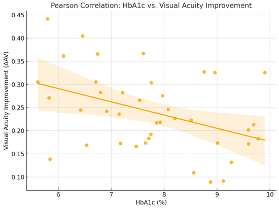 For this relationship, the Pearson correlation coefficient was r = −0.22, indicating a negative correlation between glycated hemoglobin (HbA1c) levels and final visual acuity (AV_f). The results suggest that patients with better glycemic control (lower HbA1c levels) tended to achieve more favorable visual outcomes following treatment. Although the correlation is weak, it is biologically plausible: chronic hyperglycemia impairs retinal microcirculation and may reduce the efficacy of anti-VEGF therapy [2,3].