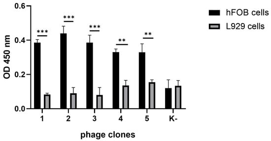 Binding specificity of selected phage clones. Absorbance at 450 nm (mean ± SD) following ELISA analysis of peptides-phage attachment to hFOB 1.19 vs. L929 cells. Phage clones with peptides n. 1–5 represent selected sequences with specificity for the osteoblastic lineage, obtained through biopanning. K– indicates a phage clone with non-specific sequence. Statistical analysis was performed using one-way ANOVA followed by Bonferroni post hoc test (** p-values < 0.01 *** p-values < 0.001). The data were derived from three independent experiments conducted in triplicate.