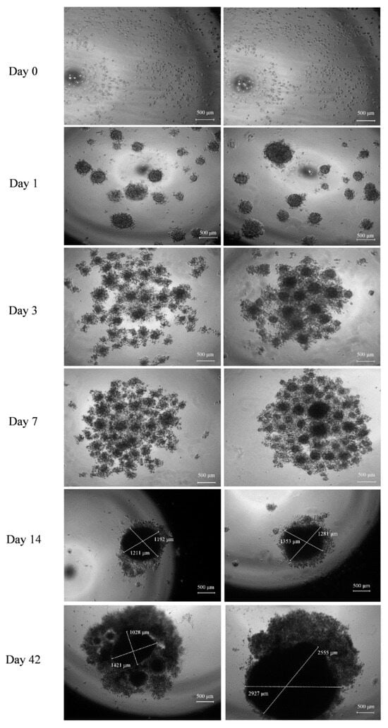 Development of 3D Spheroids Derived from Human Osteoblast Cells. Left: Control spheroids without BMP-Phage. Right: Spheroids with BMP-Phage. Representative images captured at days 0, 1, 3, 7, 14, and 42. Scale bar: 500 µm.
