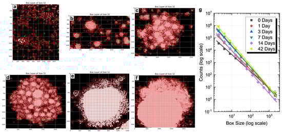 Fractal dimension analysis. Visualization of box layers with size 32: (a) Day 0, (b) Day 1, (c) Day 3, (d) Day 7, (e) Day 14, (f) Day 42 in BMP-Phage spheroids. (g) Combined box-counting fractal dimension analysis.