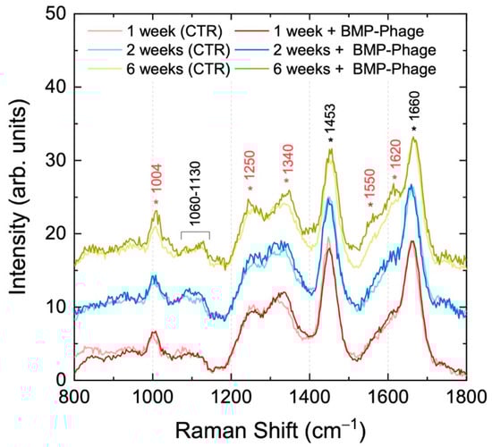 Raman spectra of 3D models with (dark colors) and without (light colors) BMP-Phage up to six weeks.