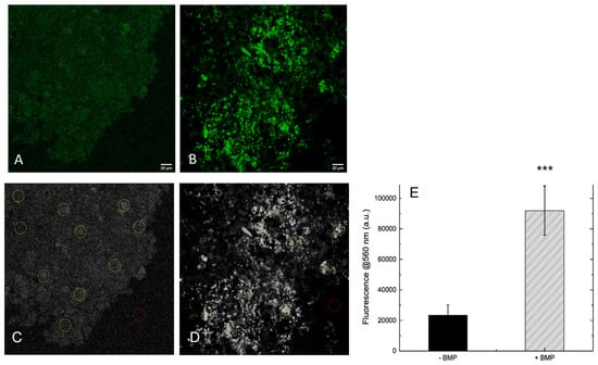 Immunofluorescence staining of SPARC (osteonectin) in 3D models visualized by confocal laser scanning microscopy (green). Representative images of spheroids generated without BMP-Phage (Control), (A) and with BMP-Phage (B) and quantification of SPARC fluorescence intensity measured at 560 nm (C). CLSM images of control spheroids (–BMP) (C) and BMP-Phage spheroids (+BMP) (D) showing selected regions of interest (ROIs) used for fluorescence quantification (E). A dedicated background ROI was included for signal normalization. Bars represent mean ± SD. Statistical analysis was performed using one-way ANOVA followed by Bonferroni post hoc test (*** p-values < 0.001). Scale bars: 20 μm.