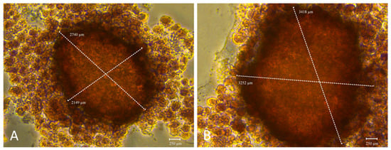 The functionality of both 3D models was further assessed by evaluating their mineralization capacity, a key hallmark of osteogenic maturation. To this end, calcium-rich deposits were visualized by staining with Alizarin Red S (ARS) (Figure 6), while alkaline phosphatase (ALP) enzymatic activity was quantified in parallel (Figure 7). These complementary assays were employed to determine whether the addition of BMP-Phage to cells improved the mineralization potential of 3D osteoblastic spheroids. Notably, mineralization analysis revealed increased calcium deposition and a larger mineralization in the BMP-Phage 3D model (3418 µm × 3252 µm) compared to the control (2740 µm × 2149 µm). These findings suggest that the BMP-Phage cocktail effectively promotes extracellular matrix deposition and enhances mineralization, highlighting its potential to support and improve osteogenic differentiation within the 3D model.