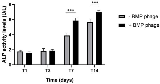 Alkaline phosphatase (ALP) activity in 3D osteoblast spheroids cultured with (+BMP-Phage) or without (–BMP-Phage) BMP-Phage at day 1 (T1), day 3 (T3), day 7 (T7) and day 14 (T14). Data are presented as mean ± SD. Statistical analysis was performed using one-way ANOVA followed by Bonferroni post hoc test (*** p-values < 0.001).