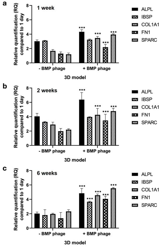 Gene expression analysis of ALPL, IBSP, COL1A1, FN1, and SPARC in 3D models using qRT-PCR. (a) 1 week, (b) 2 weeks, and (c) 6 weeks in 3D BMP-Phage spheroids (+BMP-Phage) and respective controls (-BMP-Phage). Data were normalized to GAPDH and expressed as fold changes relative to day 1. The statistical analysis was reported as *** p-values < 0.001. The data were derived from three independent experiments conducted in triplicate.