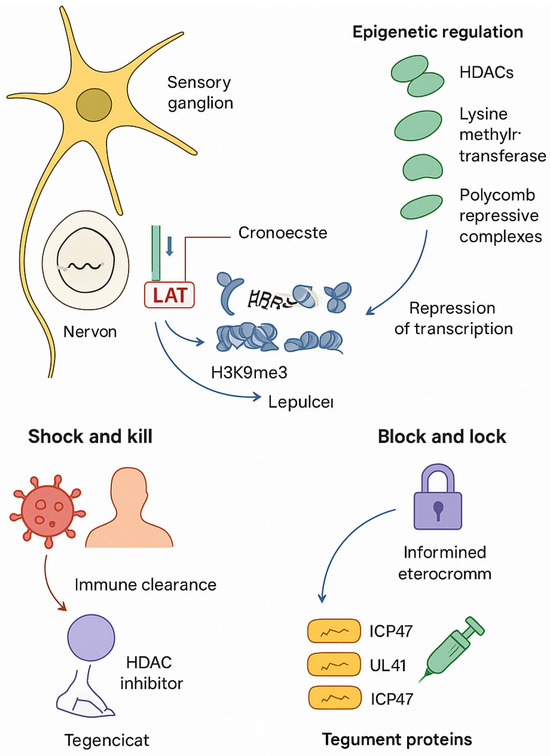 HSV latency is a critical determinant of therapeutic outcomes. After primary infection, the virus travels along sensory neurons to neuronal ganglia, where it establishes a dormant state. During latency, the viral genome persists as a circular episome, largely transcriptionally silent except for the latency-associated transcript (LAT), which helps maintain latency through apoptosis suppression, heterochromatin formation on lytic gene promoters, and modulation of host immune signaling. HSV latency is maintained by epigenetic silencing of lytic promoters through histone modifications (H3K9me3, H3K27me3), recruitment of host repressors (HDACs, polycomb proteins), and the activity of viral non-coding RNAs such as LAT, which prevents apoptosis and promotes heterochromatinization [28,29,30,31,32,33,34,35,36,37]. This molecular interplay has therapeutic implications, inspiring two main strategies: ‘shock and kill,’ which uses HDACi or EZH2 inhibitors to force viral reactivation, and ‘block and lock,’ which aims to strengthen heterochromatin and prevent viral gene expression [38]. Agents targeting lysine methyltransferases or bromodomain-containing proteins are under investigation, with attention to preserving normal host epigenetic function [39,40,41,42]. Recent preclinical work has confirmed that HDAC inhibitors such as vorinostat enhance viral gene expression by disrupting H3K9me3-mediated repression, while EZH2 blockade reduces H3K27me3 deposition and destabilizes latency. BET inhibitors (e.g., JQ1) interfere with bromodomain binding to acetylated histones, preventing reactivation of lytic promoters [43,44]. These findings underscore that HSV latency is highly dependent on chromatin remodeling and suggest that epigenetic drugs may serve as precision tools to either awaken or silence latent reservoirs.