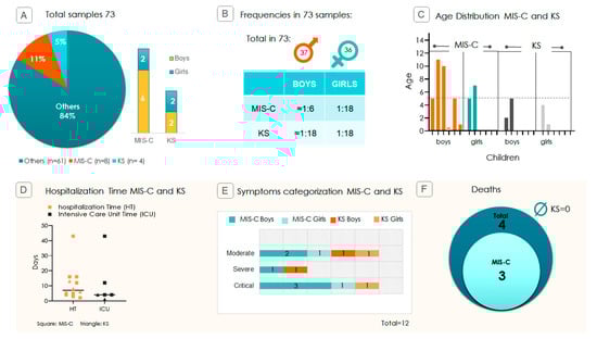 From a previous study involving 73 children with various symptoms of SARS-CoV-2 infection [], we identified 8 cases (11%) who progressed to MIS-C, including 6 boys and 2 girls, and 4 cases who progressed to KS (5%), 2 boys and 2 girls (Figure 1A). Among MIS-C cases, boys were approximately three times more affected, with one case per 6 boys and one case per 18 girls (Figure 1B). Most cases of both syndromes occurred in children under 5 years old (Figure 1C). The hospitalization rate in the ICU (Intensive Care Unit) for both MIS-C and KS was 50% (4 of 8 and 2 of 4 cases, respectively). The median hospitalization duration was 8.5 days, and the median ICU stay was 4 days among those requiring intensive care. Notably, one child experienced significantly more extended hospitalization and ICU stay (Figure 1D). Cases were classified as moderate, severe, or critical, with most falling into the severe and critical groups (Figure 1E). Of the four fatalities among the 73 children, three were associated with progression to MIS-C (Figure 1F).
