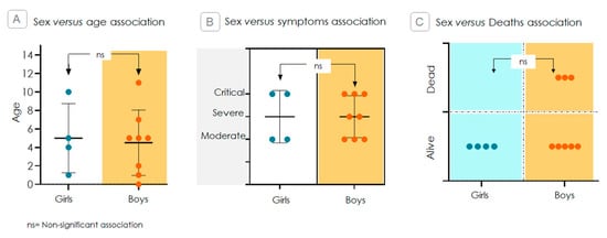Sex-specific comparison of clinical parameters in children with MIS-C/KS following SARS-CoV-2 infection. Contingency analyses using Fisher’s exact test were performed to assess associations across age, symptom severity, and mortality. Data are presented as medians ± standard deviations. Panels (A,B) show non-significant differences (ns) in age distribution and clinical severity by sex. Panel (C) indicates no statistically significant difference in mortality between boys and girls (p = 0.4909), although all deaths occurred in male patients.