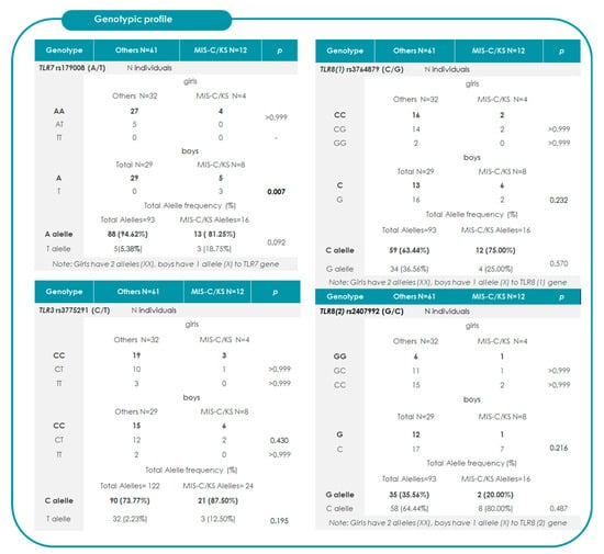 Genotypic profile of TLR7, TLR3, TLR8 (1), and TLR8 (2) variants in children with MIS-C/KS compared to other SARS-CoV-2 symptoms. Allelic and genotypic frequencies are presented for TLR7 rs179008 (A/T), TLR3 rs3775291 (C/T), TLR8 (1) rs3764879 (C/G), and TLR8 (2) rs2407992 (G/C) loci. The data include the number of individuals with other symptoms, excluding MIS-C/KS, from our previous SARS-CoV-2 study (N = 61) [], as well as the present study, which focused on children with MIS-C/KS (N = 12), including both male and female children. TLR7 and TLR8 are on the X chromosome, and TLR3 is on chromosome 4. It is important to note that for TLR7 and TLR8, girls have two X chromosomes (XX) and could, therefore, exhibit AA, AT, or TT genotypic profiles for TLR7 rs179008. In contrast, boys have only one X chromosome, so their genotypic profile can be either A or T for TLR7 rs179008. Boys are hemizygous (A or T); girls could be homozygous (AA, TT) or heterozygous (AT). Total allele frequency refers to the number of alleles, considering the allelic differences between boys and girls. Percentages of allele frequencies are shown in parentheses. The p-value was calculated from the contingency table using Fisher’s exact test. The reference for analyzing the impact of the mutations is the comparison with the non-mutated genotype, highlighted in bold in the table. p-values < 0.05 are significant.
