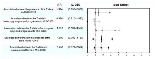 Relative-risk analysis of the TLR7 rs179008 T allele in relation to progression to MIS-C/KS and clinical severity. TRL7 rs179008, boys are hemizygous (A or T); girls could be homozygous (AA, TT) or heterozygous (AT), but they were only homozygous in this study. Forest plot displaying relative risks (RR) and 95% confidence intervals (CI) for the presence of the T allele across multiple clinical profiles. Contingency tables were generated, with RR and CI calculated using the Koopman asymptotic score, and statistical significance assessed via Fisher’s exact test. Points to the right of the vertical “no effect” line (RR = 1) indicate a positive association; points to the left indicate a negative association, and intervals crossing the line denote non-significant relationships. The orange asterisk indicates statistical significance.