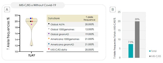 Comparison of TLR7 rs179008 T allele frequencies between MIS-C/KS cases and reference populations. (A) Violin blot illustrating T allele frequency among children with MIS-C/KS, compared to five public population databases representing individuals without COVID-19. The dashed line represents the median. Frequencies in the MIS-C/KS group did not differ significantly from those in the reference databases. Minimum–maximum vertical lines indicate the full range, and the shape reflects the distribution density. (B) Bar graph comparing T allele frequency between the pediatric groups from our study: total of children with SARS-CoV-2 infection (N = 73, blue) [] and those who developed MIS-C/KS (N = 12, gray).