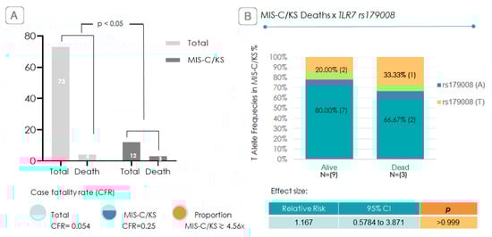 Lethality comparison and T allele association in MIS-C/KS cases. (A) Bar chart comparing case fatality rates (CFR) among 73 children hospitalized with COVID-19 versus the 12 children who developed MIS-C/KS. The fatality rate in the MIS-C/KS subgroup is approximately 4.56-fold higher than the total of 73 COVID-19 hospitalized children (p < 0.05). (B) Relative-risk analysis of the TLR7 rs179008 T allele in MIS-C/KS cases, stratified by survival. Below is the description of the relative risk, confidence interval (95%), and p-value for the T genotype appearing in death cases.
