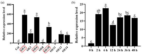 Relative expression levels of the MfWRKY40 gene in different Arabidopsis thaliana lines and analysis of its expression patterns in Medicago falcata under mannitol stress. (a) Relative expression levels of the MfWRKY40 gene in wild-type (Col) and different transgenic (OEs) A. thaliana lines. (b) Relative expression levels of the MfWRKY40 gene in M. falcata under 300 mM mannitol treatment at 0, 2, 6, 12, 24, 36, and 48 h. The transgenic A. thaliana lines (OE1, OE6, and OE10) with high expression levels (highlighted in red) were selected for further experiments. All values are expressed as the mean ± standard error (n ≥ 3). The different lowercase letters indicate significant differences among various lines (a) and significant differences among different time points after 300 mM mannitol treatment (b) (p < 0.05). Error bars represent the standard error among replicates.