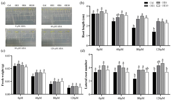 Phenotype comparison of wild-type (Col) and transgenic (OEs) A. thaliana lines grown on medium supplied with different concentration of ABA for 7 d. (a) Phenotypic images of A. thaliana seedlings. (b) Root length. (c) Fresh weight. (d) Lateral root number. All values are expressed as the mean ± SE (n ≥ 15). The different lowercase letters at the same ABA concentration indicate significant differences among the four lines (p < 0.05). Error bars represent the standard error among replicates.