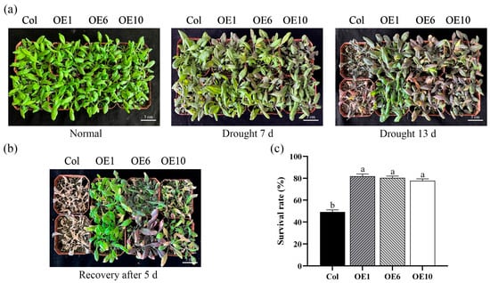 Phenotypes and survival rate of wild-type (Col) and transgenic (OEs) A. thaliana under drought stress. (a) Phenotypic images of A. thaliana under drought stress. Scale bar = 3 cm. (b) Phenotypic images of A. thaliana after 5 d of rewatering. Scale bar = 3 cm. (c) Survival rate after 5 d of rewatering. All values are expressed as the mean ± SE (n ≥ 3). The different lowercase letters indicate significant differences among the four lines (p < 0.05). Error bars represent the standard error among three replicates.